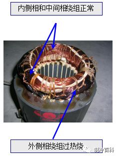 缺相运行:星型电机在缺相条件下,会造成两相绕组过热烧毁,而一相绕组完好。