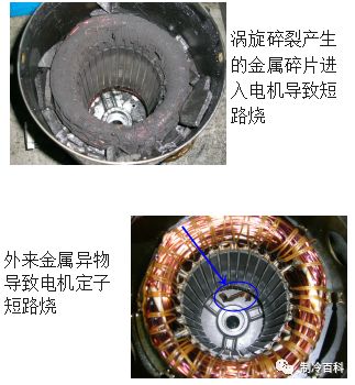 9.1、异物进入电机定子导致漆包线短路烧毁:异物或机械故障产生的金属碎屑进入到电机内部会导致电机漆包线短路烧毁。